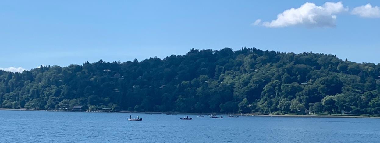 A portion of NLA hillside with 250 cabins as seen from Lake Nojiri. A couple dozen fishing skiffs usually on the lake.